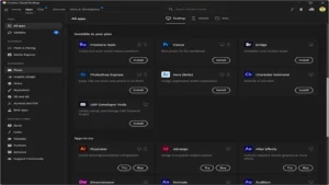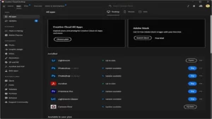 بمجرد قيامك بفتح تطبيق Adobe Creative Cloud PC فإنه ستظهر أمامك الواجهة الرئيسية للبرنامج، وفي هذه الواجهة سوف تتمكن من أن تجد جميع البرامج الخاصة بادوبي، كما تستطيع الوصول إلى البحث عن برامج أخرى.