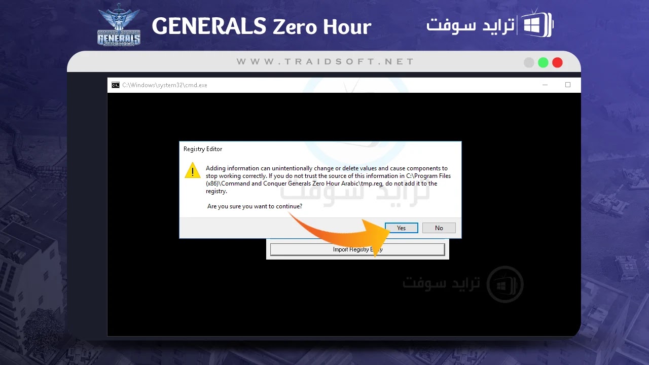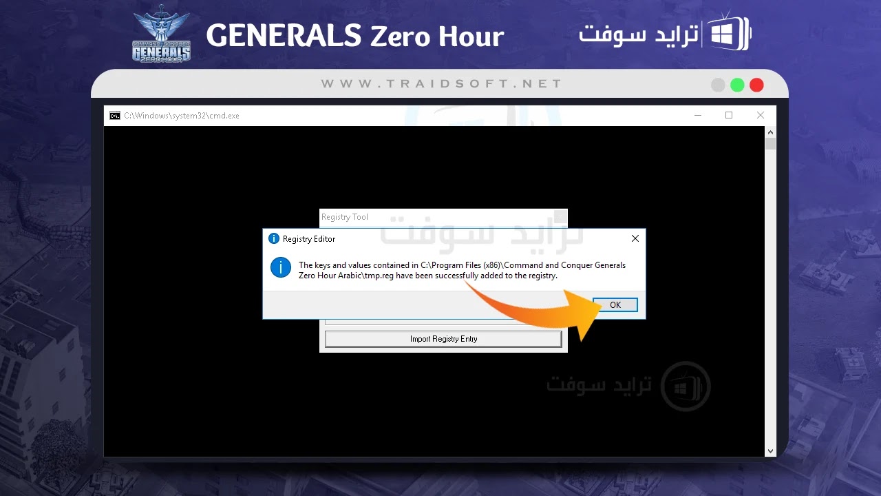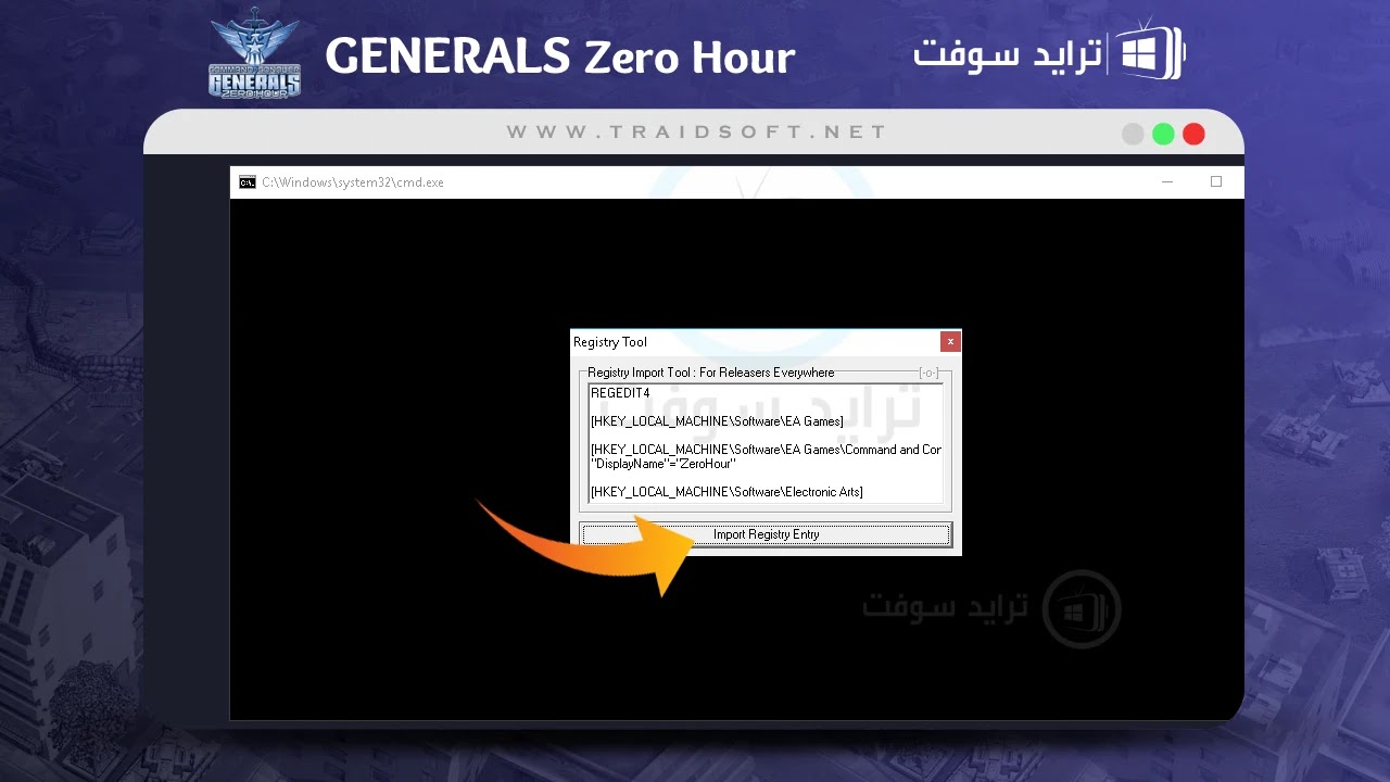 - بعد اكتمال الشريط وانتهاء العملية بنجاح ستخطي صفحة الأداة السابقة وتظهر صفحة منبثقة بعنوان ( Registry Tool ) وهي صفحة تخبرك ان العملية الخاصة بتثبيت لعبة Generals Zero Hour العربية تمت بنجاح ولكن لن تتم حتى الآن اضافة أداة التسجيل أو أداة الفتح الخاصة باللعبة, قم الآن بالنقر على الزر الموضح في الصفحة وهو زر ( Import Registry Entry ).