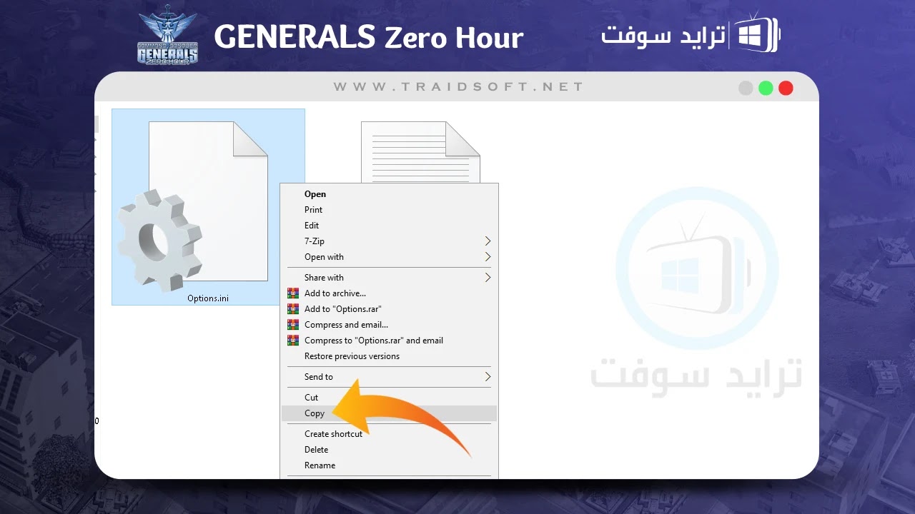 - داخل المجلد لن تجد سوي ملفين وهما يخصوا لعبة Generals Zero Hour للكمبيوتر او تحديد تفعيلها, قم الآن بالضغط ( كليك يمين ) للملف الموجود بعنوان ( Options ) المشار الية ومن القائمة وتحديد زر ( Copy ) انسخ هذا الملف.