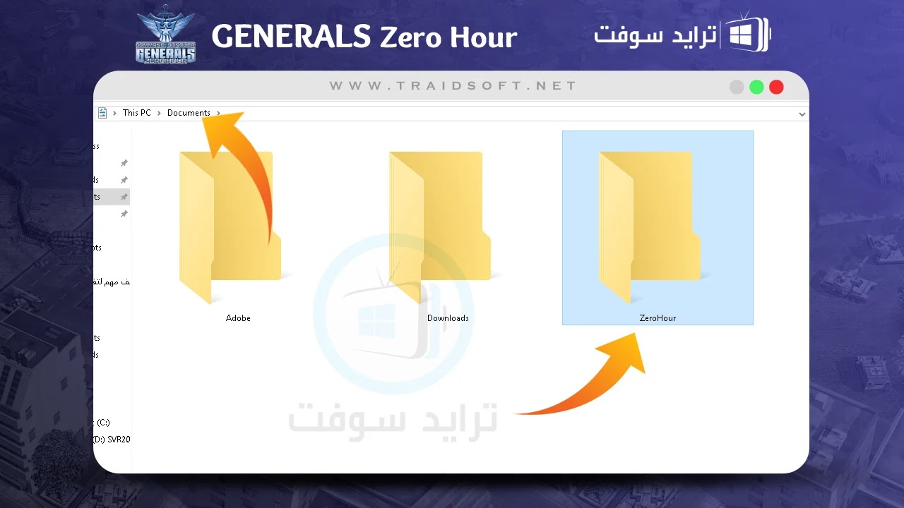 - الآن وبعد نسخ الملف السابق عليك الوصول الى مجلد تشغيل لعبة Generals Zero Hour الرئيسي على الجهاز نفسه, المجلد تمت عملية اضافته تلقائيا بعد تثبيت اللعبة ويكون مقترح من الجهاز دائما, اذهب الى مجلد الـ ( Documents ) من الحاسوب نفسه وداخل هذا المجلد سوف تجد مجلد مختلف بأسم اللعبة افتحه.