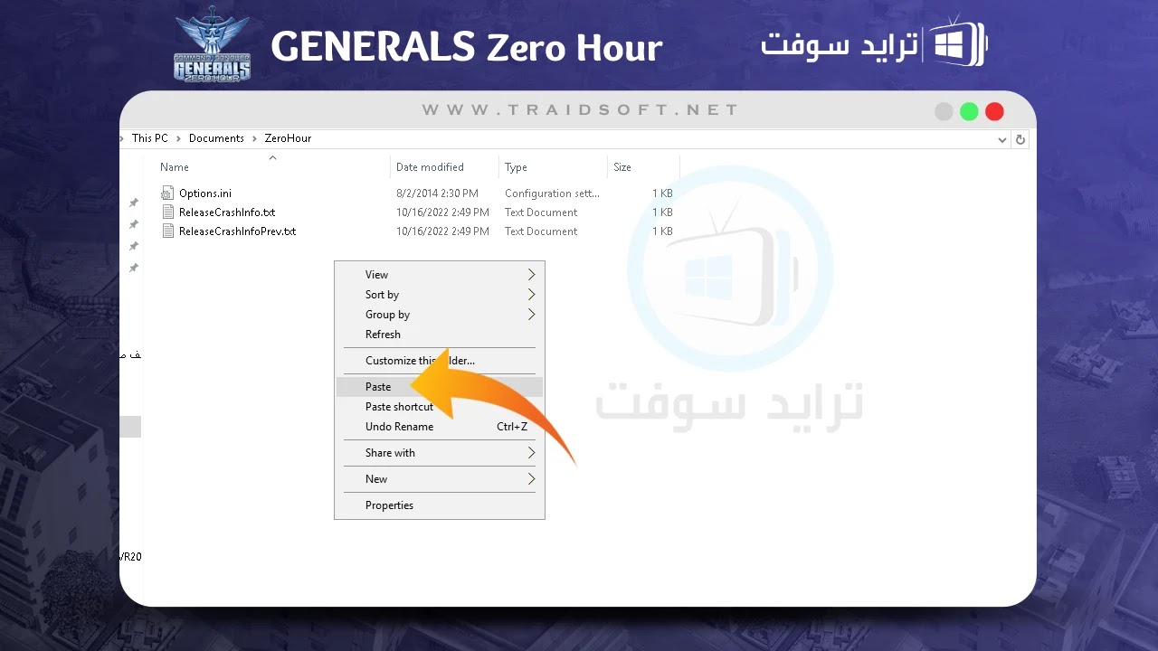 - الآن ستجد بالفعل أيقونة لعبة Generals Zero Hour العربية ظهر على سطح المكتب لجهازك, قبل فتح اللعبة عليك اولا اضافة بعض الملفات إليها وهي ملفات التفعيل, عليك اولا اضافة بعض الملفات المتخصصة في تفعيل الاصدار العربي من اللعبة الى الملف الخاص بالتشغيل, سنقوم في الخطوات التالية الآن بتوضيح كيفية القيام بهذا الأمر.