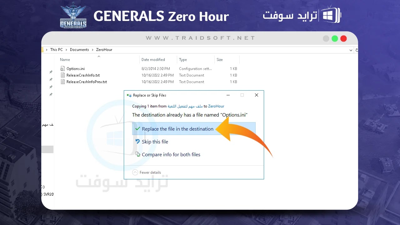 - قبل القيام بعملية اللصق ستظهر أمامك صفحة توضح ان هذا الملف يوجد ملف بنفس اسمه في المجلد ويعرض عليك الحاسوب عدم استكمال العملية لعدم امتلاك نفس الملف مرتين, هذا الأمر غير صحيح لان الملفات مختلفة في الوظيفة وتتشابه في الاسم فقط, انقر زر ( Replace The File In The Destination ) وهو الخاص بلصق الملف على أي حال.