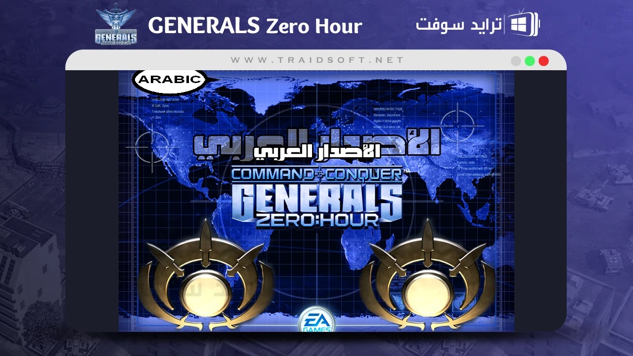 - واخيرا بعد تنفيذ جميع الخطوات السابقة بالطريقة الصحيحة سوف تجد صفحة اللعبة الافتتاحية ظهرت أمامك وفي منتصف الصفحة اسم اللعبة وأعلى الاسم كلمة ( الاصدار العربي ) وهذا يوضح أن قُمت بـ تحميل لعبة الجنرال Generals Zero Hour بشكل سليم على الكمبيوتر الخاص بِك.
