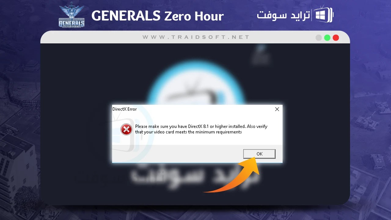 - بعد محاولة فتح لعبة Generals Zero Hour كاملة من الايقونة الموضحة سوف تظهر لك رسالة تخبرك بأن شرط من شروط بدأ اللعبة هو امتلاك برنامج ( DirectX ) على جهازك من الإصدار 8.1 واحدث, لا تقلق من هذه الرسالة ولاننا سنقوم الآن بتوضيح طريقة امتلاك البرنامج في عدة خطوات بسيطة, اضغط زر ( Ok ) لتختفي الرسالة وتابع الخطوات.