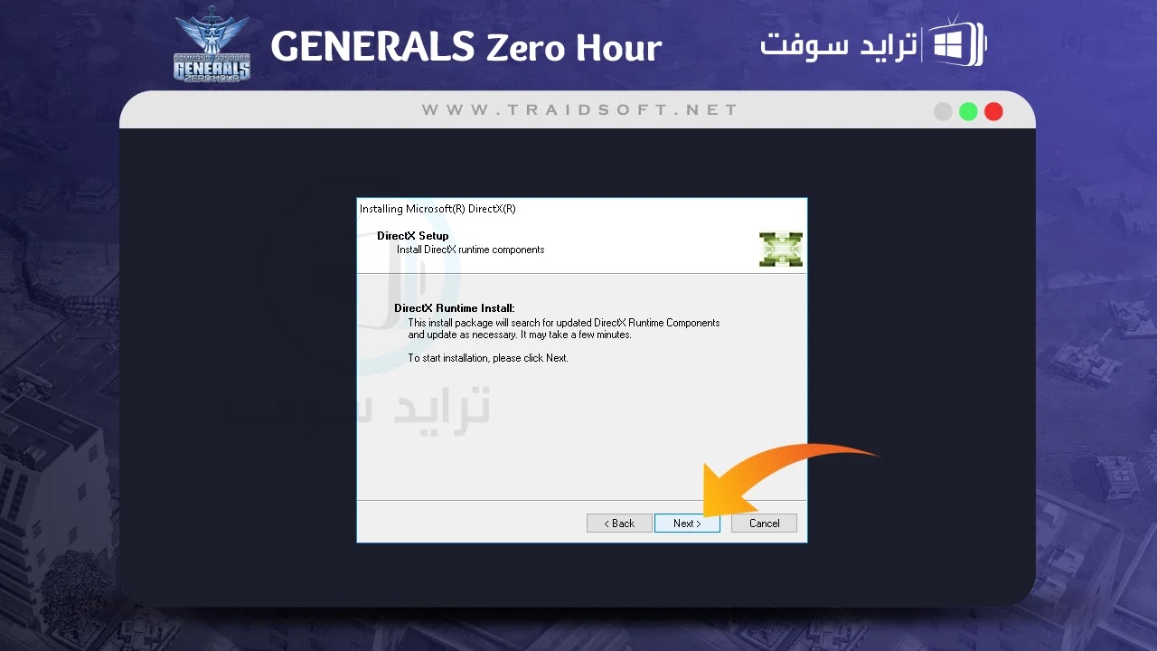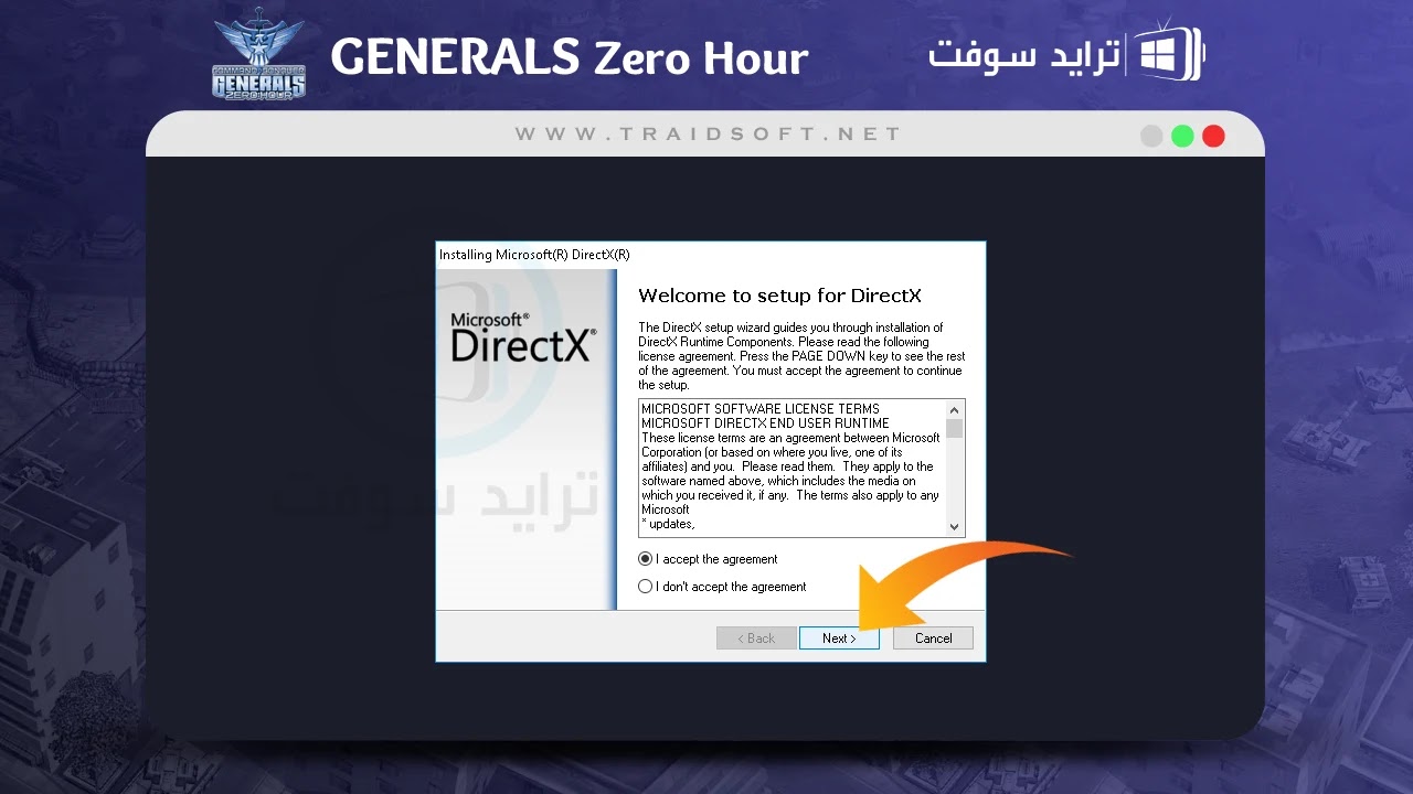 هذه الفقرة من أهم الفقرات في الموضوع, سنقوم الآن بشرح طريقة حل المشكلة الخاصة ببرنامج ( Microsoft Directx ), قم الآن بفتح لعبة Generals Zero الاصلية من الايقونة في سطح المكتب واتبع الخطوات بعناية.