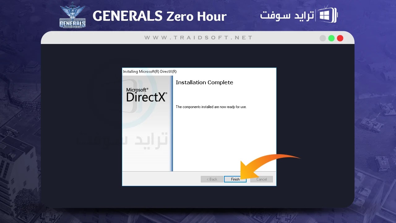 - ستختفي الصفحة تلقائيا بعد الانتهاء من التثبيت وتظهر صفحة أخرى تحتوي على رسالة ( Installation Complete ), هذه الرسالة تدل على ان البرنامج اصبح موجود على الكمبيوتر الخاص بك, اغلق الاداة الموضحة من زر ( Finish ), وافتح لعبة Generals Zero كاملة مرة أخرى الآن ولن تواجه أي مشكلة وسيتم فتحها نجاح على جهازك الكمبيوتر.