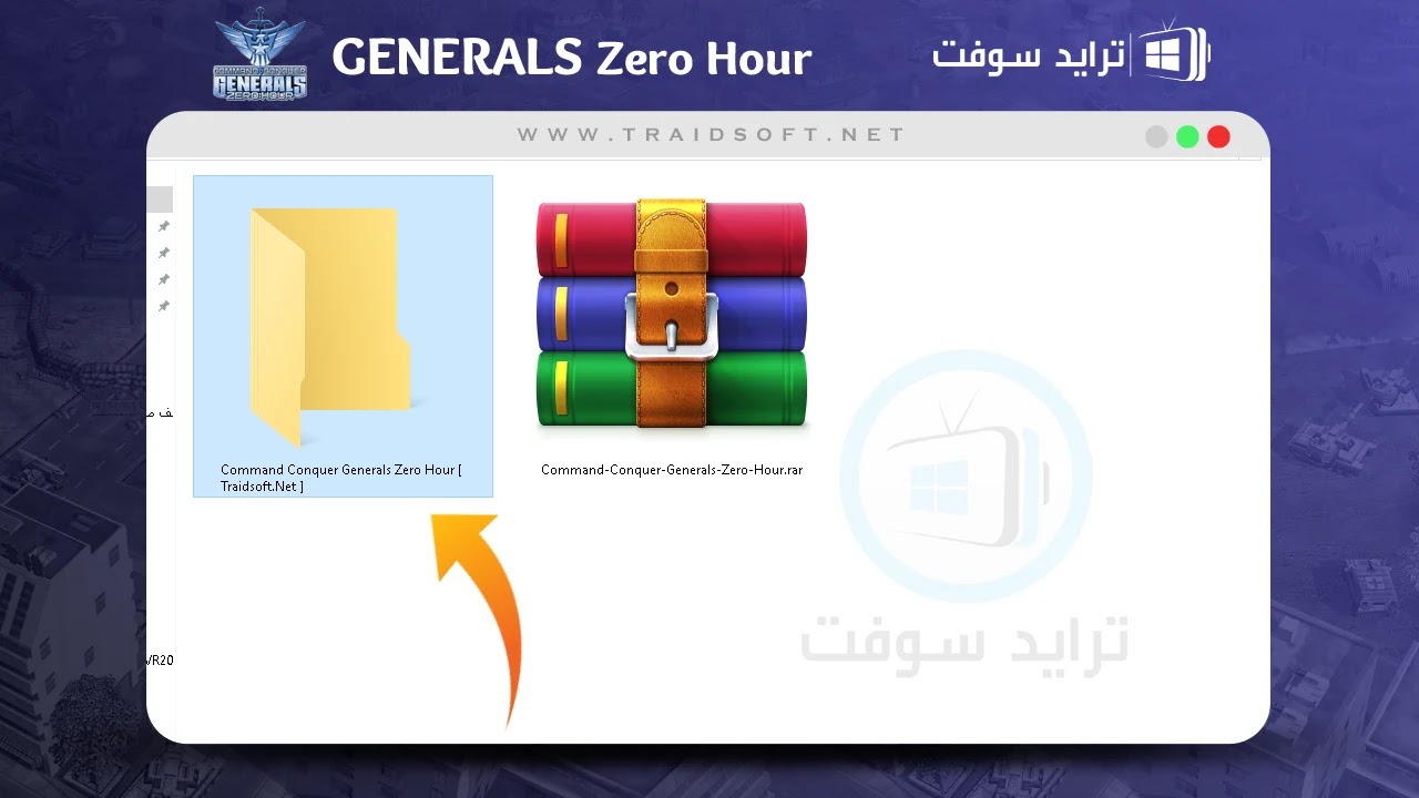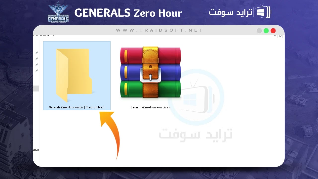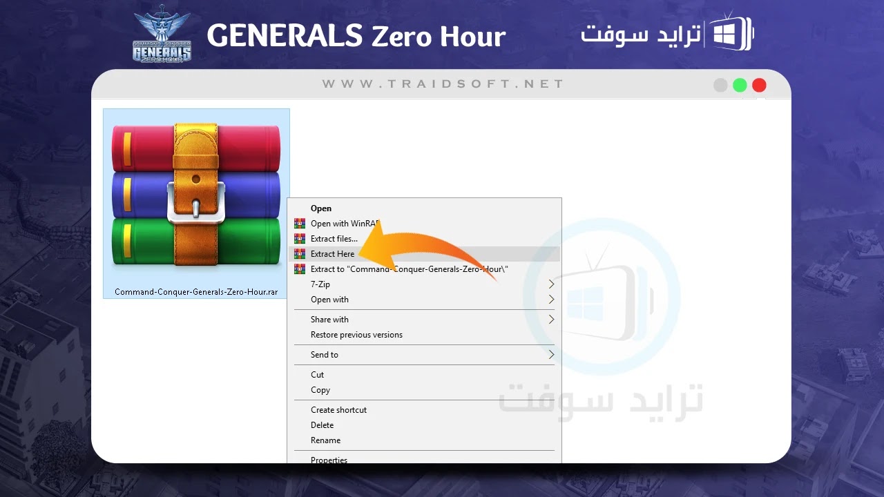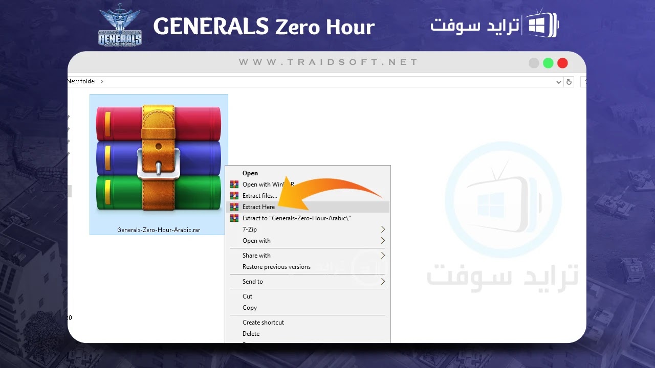 - تأكد من اكتمال “تحميل لعبة جنرال زيرو” العربية بنجاح ثم اذهب الى مجلد التنزيلات على الكمبيوتر الخاص بك وسوف تجد بالمجلد ملف مضغوط في صيغة RaR بعنوان ( Generals Zero Hour Arabic ), هذا هو الملف الذي قمت بتنزيله في الخطوة السابقة ويمكنك من خلاله تنزيل النسخة العربية للعبة, عليك الآن فك ضغط هذا الملف لذلك تأكد من وجود إحدى برامج فك الضغط مثل ( WinRaR ) ثم اضغط الملف ( كليك يمين ) ومن القائمة اختر ( Extract Here ).