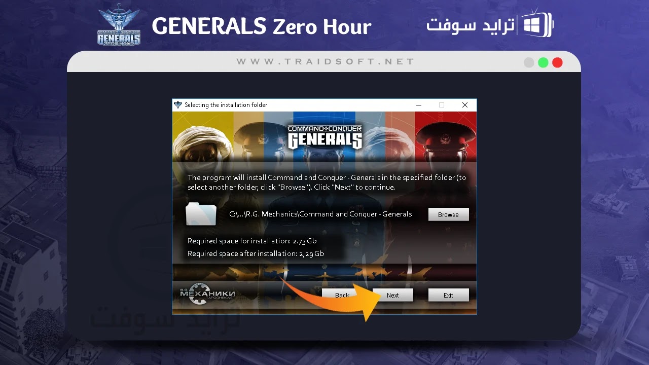 - قبل بدأ عملية التفعيل في لعبة جنرال زيرو الاصلية Generals Zero Hour عليك ضبط بعض الإعدادات الخاصة باللعبة قبل تثبيتها, هذه الصفحة تقوم فيها بتحديد المكان الذي تريد تنصيب فيه المجلد الجديد في ملفات الحاسوب, قم بنقر زر ( Browse ) ومنه قم بتحديد المكان وبعدها اضغط زر ( Next ).