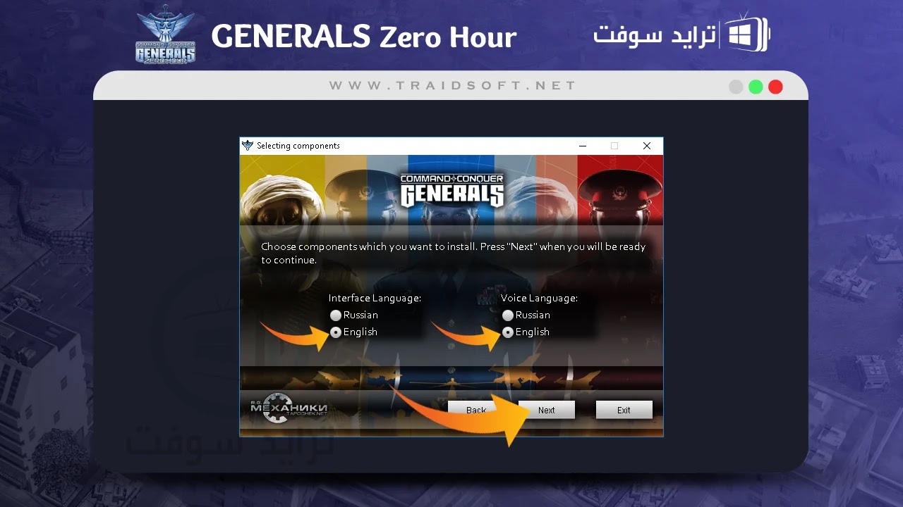 - ثاني الإعدادات هي اختيار اللغة للرسائل الكتابة والأصوات, كما ذكرنا لا تتوفر إلا اللغتين الانجليزية والروسية قم بتحديد اللغة التي تريدها جهة اليسار للمحادثات الكتابية واي كلمات تظهر باللعبة وجهه اليمين للأصوات بين الجنود باللعبة وبعدها أنقر على ( Next ).