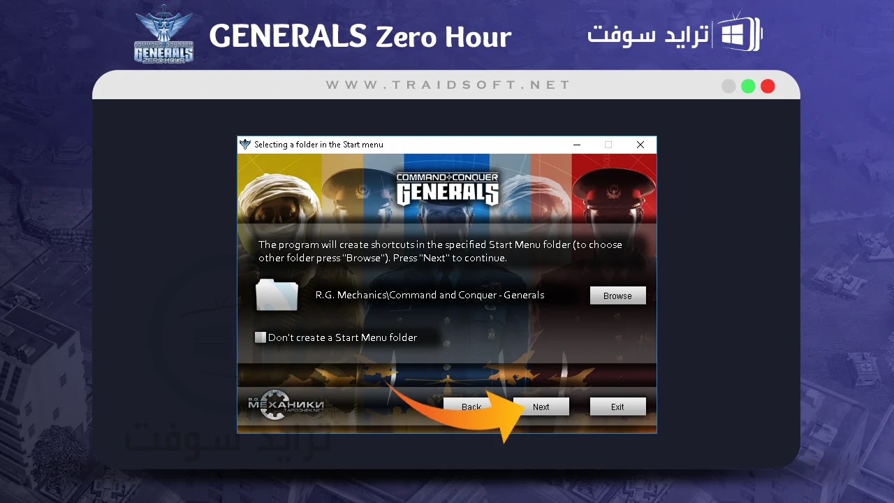 - الآن مع خيار اضافة اختصار في قائمة البدء لسهولة فتحها ام لا, اذا كنت تريد اضافة اختيار لعبة جنرال زيرو الاصلية Generals Zero Hour في فولدر معين على الجهاز قم بتحديده من زر ( Browse ) وبعدها انقر زر ( Next ) لتخطي هذه الخطوة.
