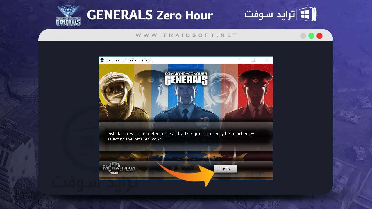 - بعد الانتظار الوقت كما ذكرنا سيختفي الشريط وكل ما يخص التنصيب وتظهر أمامك رسالة توضح أن اللعبة الآن جاهزة للتشغيل, هذه المرة لن تظهر أي مشاكل أثناء محاولة تشغيل Generals Zero Hour, اغلق الصفحة الموجودة أمامك من زر ( Finish ).