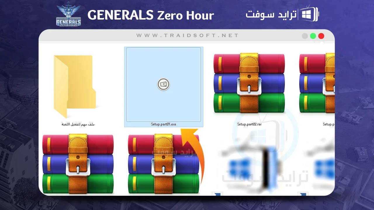 - بهذا المجلد ستجد الكثير من العناصر المختلفة وجميعها خاص باللعبة ووجوده مهم, ستجد ملفات للتفعيل وحل المشاكل وملفات خاصة بالتشغيل, عليك الآن فتح الاداة الخاصة بعملية تنصيب لعبة جنرال زيرو عربي وهي الموضحة أمامك بأسم ( Setup Part01 ).