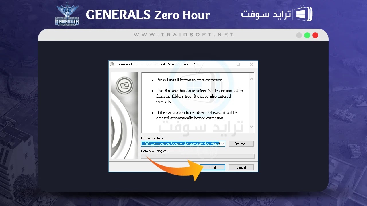 - ستظهر أمامك الآن أداة التنصيب الخاصة بلعبة جنرال زيرو عربي Generals Zero Hour, توضح أولى الصفحات من الأداة خطوات التنصيب, سنقوم بتوضيحها معكم ايضا لذلك انقر على زر ( Install ) الخاص ببدء العملية.