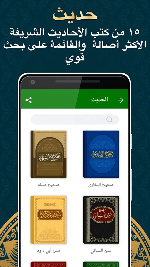 - تظهر لك الآن قائمة بها كتب متنوعة خاص بالحديث الشريف, قم باختيار الكتاب الذي تريده بواسطة الضغط علية, او يمكنك البحث عن كتاب بعينه من خلال شريط البحث الذي يوجد أعلى الصفحة.