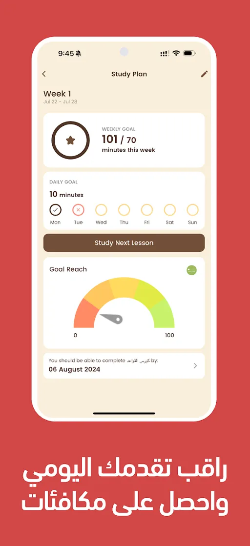- الصفحة الحالية يخبرك فيها التطبيق بأنك ستجد الدروس جميعها مغلق ما عدا الدرس الاول ولا يمكنك فتح الدروس الى بطريقة متتالية بعد تخطي اختبار الدرس السابق بنجاح, هذا الأمر يساعد المستخدمين على الدراسة بشكل صحيح, يمكنك تمرير الصفحة جهة اليمين لترى باقي المعلومات من التطبيق.