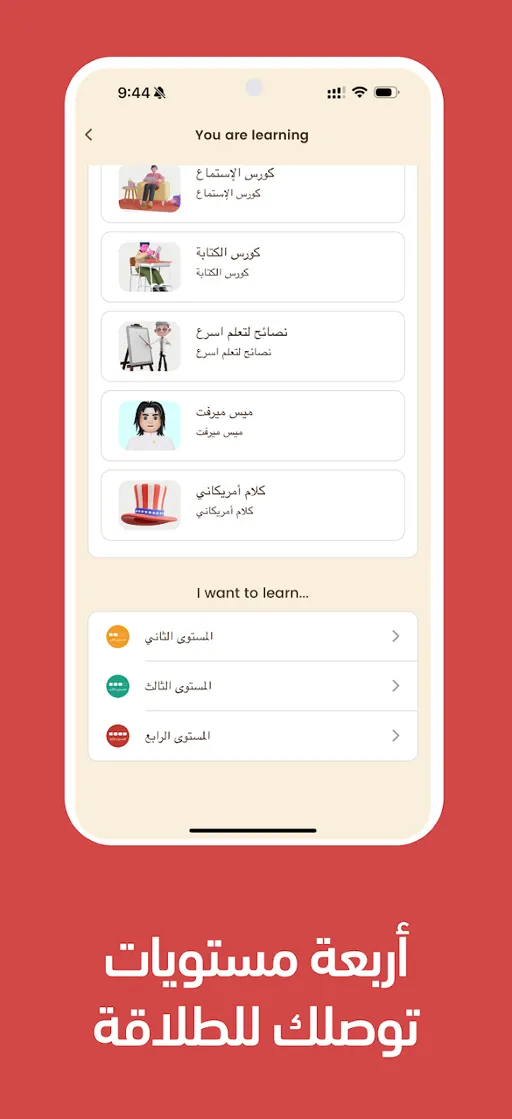 - كل مستوى يحتوي على مجموعة كبيرة من الكورسات الخاصة به, المستوى الأول هو اسهل المستويات الموجودة ستجد بداخله كورس قراءة وكورس استماع وكورس صوتيات وكورس آخر للقواعد, والكورس الأساسي وهو للمبتدئين ( تعلم من الصفر ), جميع الكورسات مترابطة ويجمعها مستوي واحد, انقر الآن على أي كورس منهم لشرح طريقة عرض الدرس.