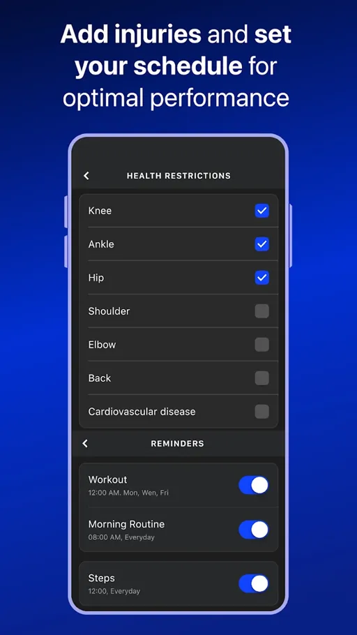 - تخصيص كامل وشخصي : بعد تحميل تطبيق Muscle Booster مهكر وعِند التسجيل للمرة الأولى سيتم العمل على توفير جولة تعريفية دقيقة تأتي مع إستبيانات حول اللياقة الحالية والأهداف والبيئة المٌفضلة للتمرين, هذه الجولة تقوم ببناء خِطة تدريب مٌخصصة لكٌل مستخدم.