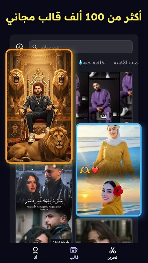 - قوالب تعديل جاهزة ومتنوعة : يوفر تطبيق فيفا كات مهكر آلاف القوالب الجاهزة المصنفة حسب الاحتياج، كقوالب التيك توك والثري دي وغيرها. كل ما عليك فعله هو اختيار القالب والضغط عليه، ثم تبديل العناصر وتغيير النصوص والموسيقى لتحصل على فيديو احترافي في دقائق معدودة.