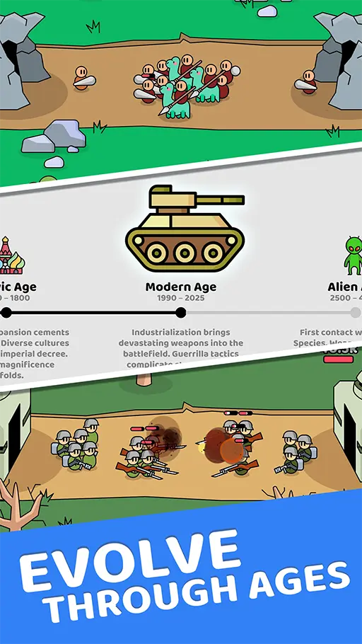 يتضمن نظام تطور القوات في لعبة We Are Warriors Mod Apk مهكرة مرحلة الثورة الصناعية التي تُتيح لك الوصول إلى وحدات مسلحة بأسلحة نارية بدائية وآليات حربية ضخمة، وهذا التنوع الهائل في أنواع المحاربين عبر العصور المختلفة يمنحك مرونة كبيرة في بناء تشكيلة جيش متوازنة تستطيع التعامل مع أي نوع من أنواع الهجمات.